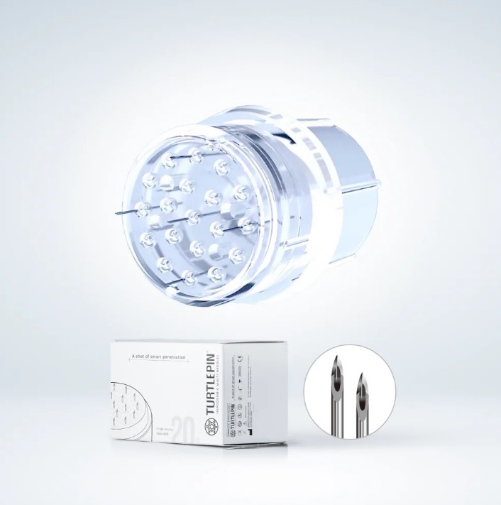 Il TURTLEPIN da 2,0 mm con 5 micro-aghi ultra sottili offre un’iniezione precisa con penetrazione fino al derma profondo. Questo dispositivo medico certificato CE è progettato per iniezioni perpendicolari, clinicamente provato per migliorare l’assorbimento con dolore e infiammazione minimi.