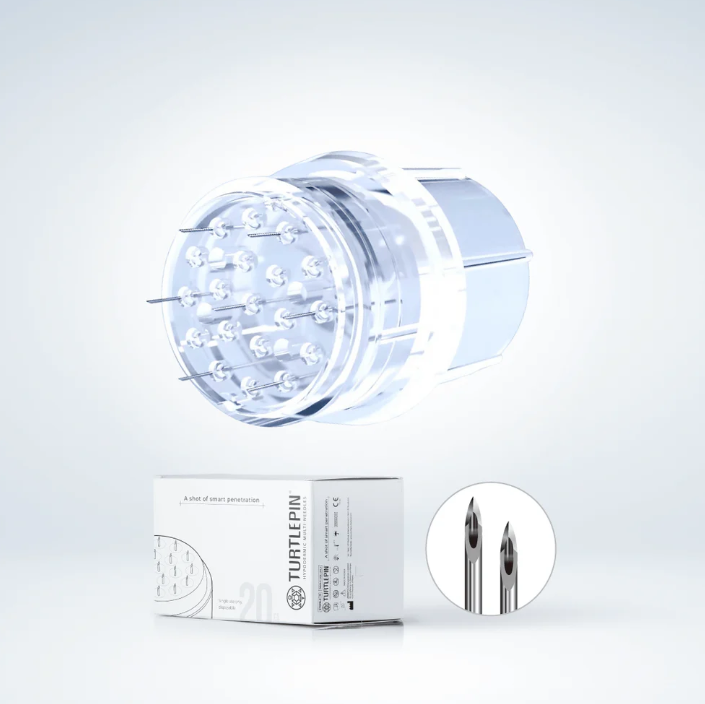 Il TURTLEPIN da 2,0 mm con 7 micro-aghi ultra sottili offre un’iniezione precisa con penetrazione fino al derma profondo. Questo dispositivo medico certificato CE è progettato per iniezioni perpendicolari, clinicamente provato per migliorare l’assorbimento con dolore e infiammazione minimi.