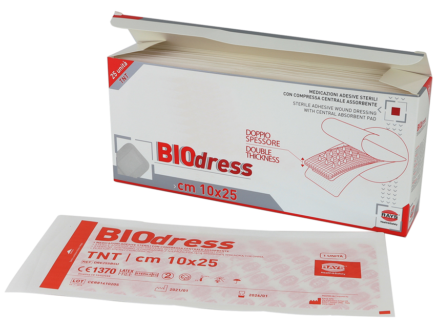 Medicazione adesiva sterile in TNT con compressa centrale assorbente in tessuto non tessuto piegato, non aderente alla ferita;