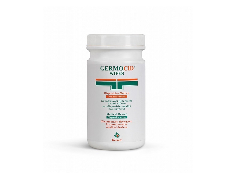 - I fazzolettini GERMOCID WIPES 220 sono studiati specificatamente per la detersione e la disinfezione di dispositivi medici non invasivi (riuniti, piani di lavoro, braccioli, maniglie, turbine, maschere facciali, poggiatesta, etc.) in uso presso i centri estetici e gli studi medico/dentistici. GERMOCID WIPES 220 ha un elevato potere detergente ed evapora rapidamente. La presenza di materiale organico (come sangue, saliva o essudati organici) non altera la sua efficacia e non condiziona il suo lavoro.