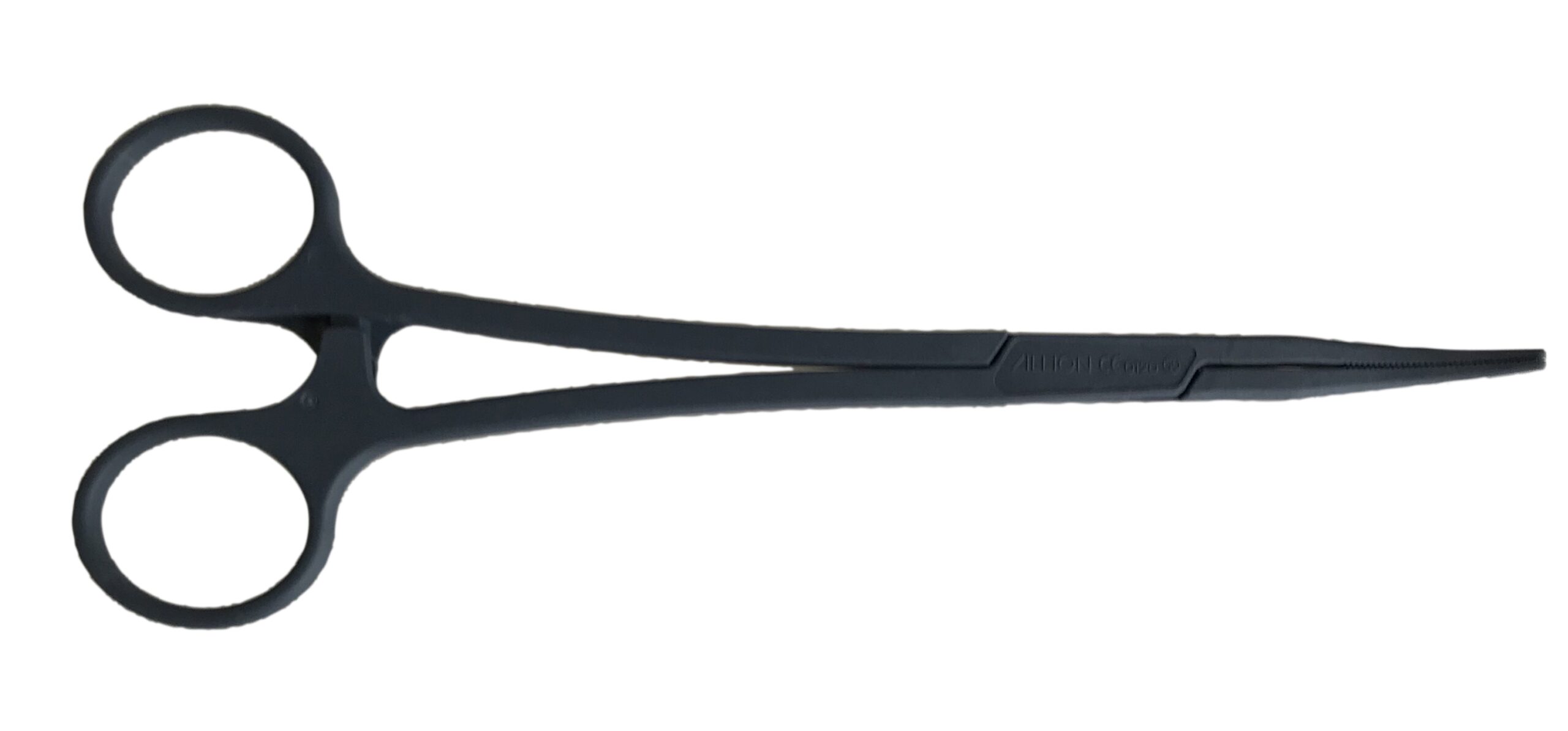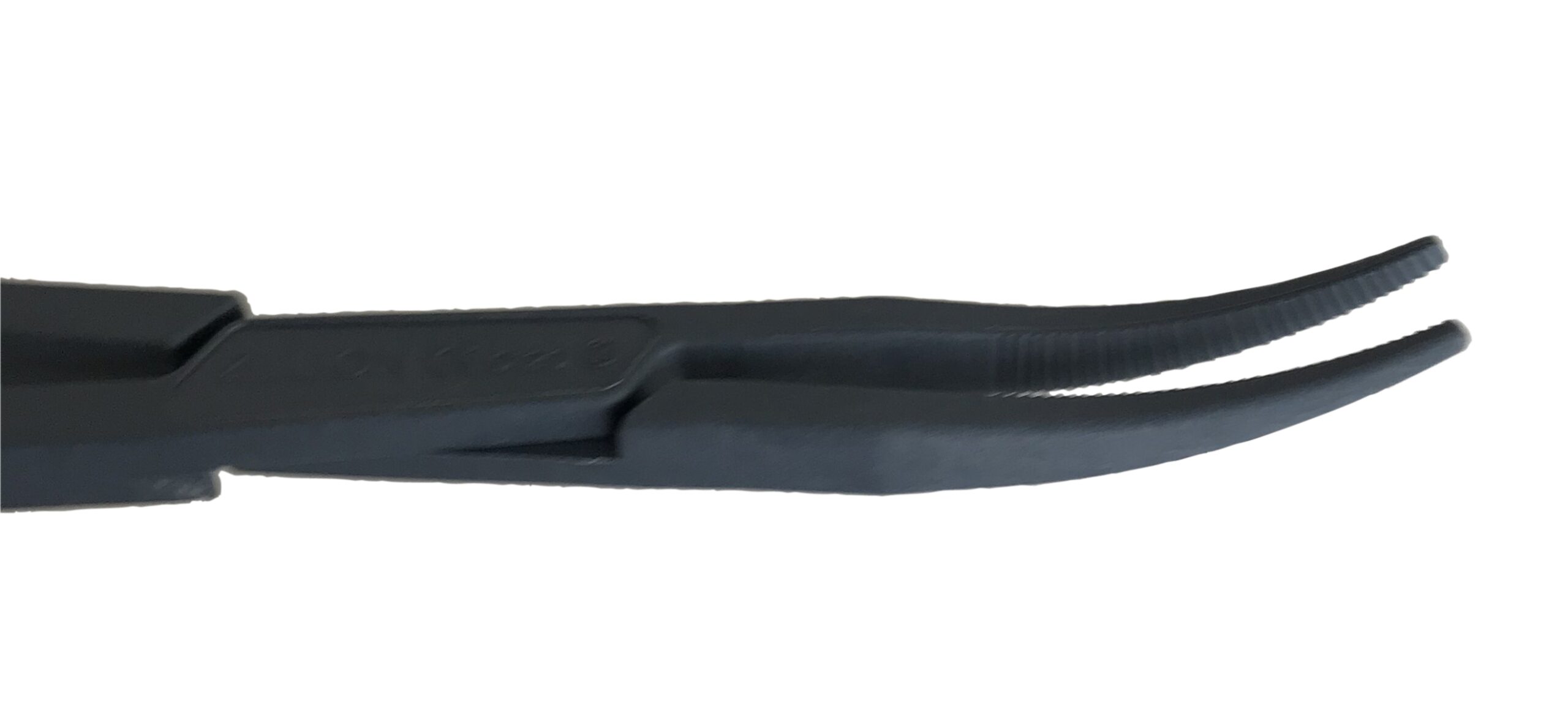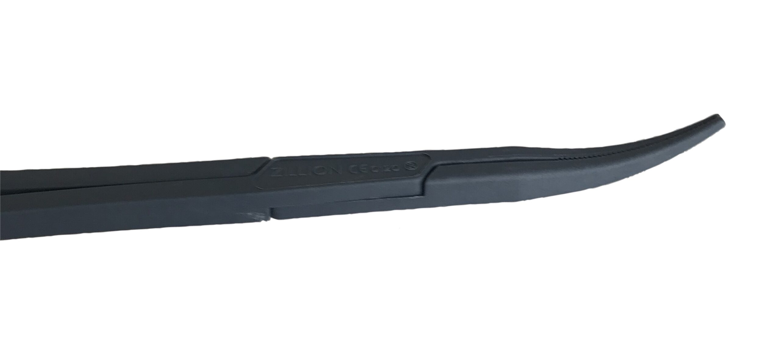 Pinza Birkett curva. Realizzata con polimeri di alte prestazioni che conferiscono rigidità alla pinza. Lunghezza 18,5 cm.