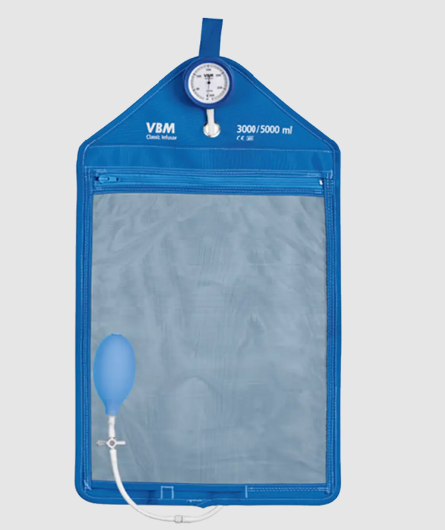 Scomparto sacca in rete trasparente per visualizzare il livello della sacca di soluzione Versione con cerniere. Manometro di precisione con range pressione 0-300 mmHg. Pompetta di gonfiaggio a mano con ampio volume per insufflazione rapida e valvola rilascio pressione e manometro. Riutilizzabile. Camera di gonfiaggio sostituibile
