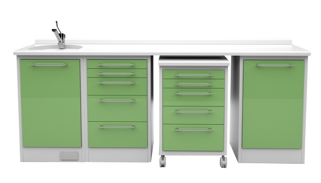 Set formato da 4 moduli di cui 1 su ruote, possibilità di avere i moduli con piedini o con base. Il piano può essere in laminato o in corian.