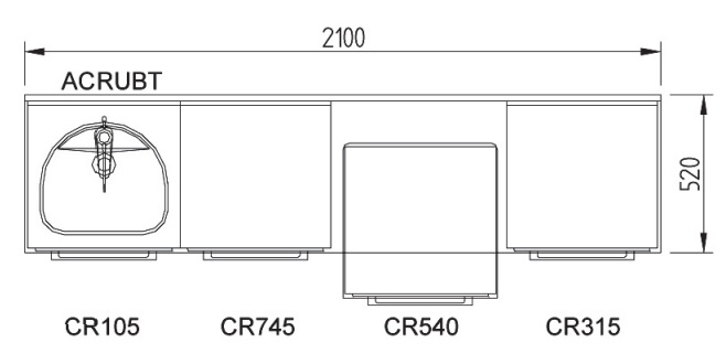 1 modulo 5 cassetti: nr.2 cassetti da mm 70 e nr.2 bacinelle, nr.2 cassetti da mm 142 e nr.2 bacinelle, nr.1 cassetto da mm 214 e nr.1 bacinella.