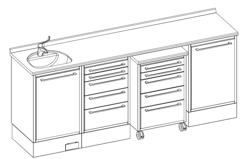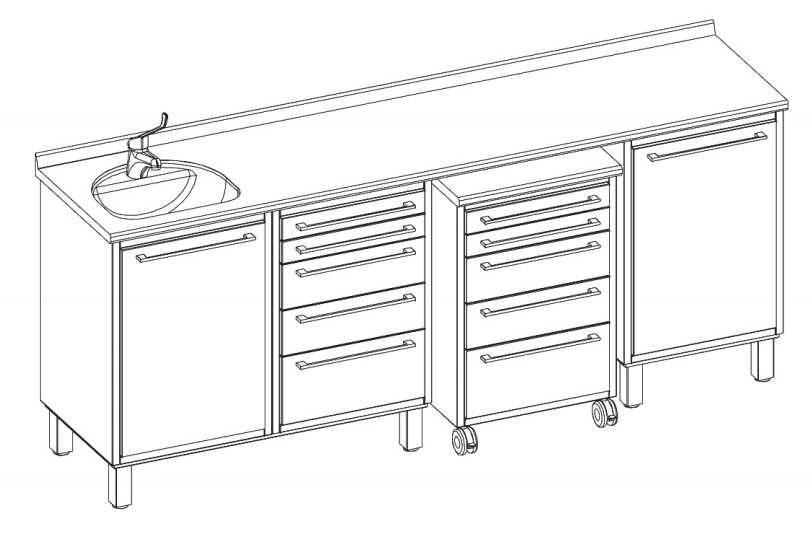 1 modulo 5 cassetti con nr.4 ruote pivottanti Ø75: nr.2 cassetti da mm 70 e nr.2 bacinelle, nr.2 cassetti da mm 142 e nr.2 bacinelle, nr.1 cassetto da mm 214 e nr.1 bacinella. 1 modulo anta: nr.1 anta cerniere a dx mm 646, nr.1 ripiano interno posizionabile.