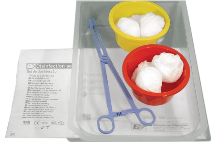 Set disinfezione sterile composto da: 1 ciotolina in plastica monouso 250 ml rossa, 1 ciotolina in plastica monouso 250 ml gialla, 1 pinza in plastica da 24 cm, 6 tamponi di garza diametro 60 mm