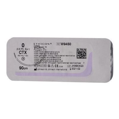 Suture Ethicon Vicryl, assorbibile per via idrolitica , minimo fino al 40° giorno; completo tra il 56° ed il 70° giorno. Disponibile in diverse misure
